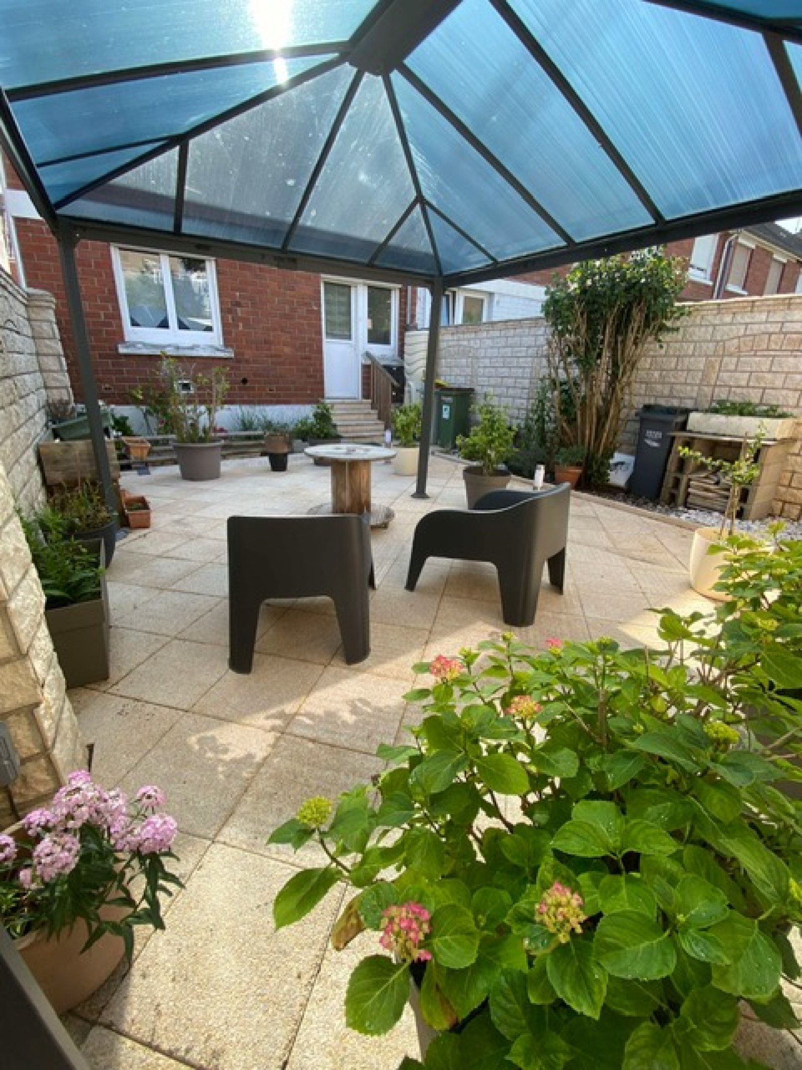 Pour l'extérieur : bel espace terrasse de + 50m² bien exposé, avec dépendance.